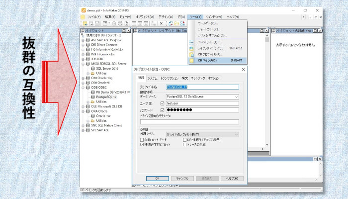 InfoMakerの機能の一つ、DBペインタを使って互換性のあるデータベースへの接続の設定が直感的にできます。