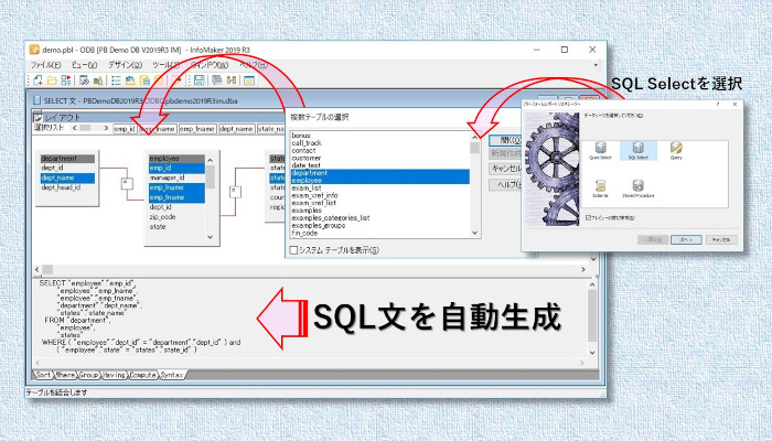また、データウィンドウは、SQL Selectで複数のデータベースのテーブルやカラムをマウスで直感的な操作だけで設定できるだけでなく、SQL文を自動生成します。
