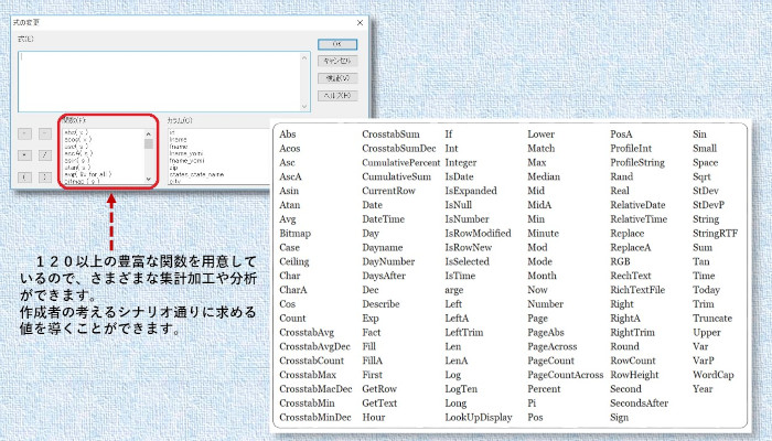 InfoMakerには豊富な関数が用意されており、データ表示および変更するための式で利用できる120以上の関数によってデータの加工に多彩さを与えます。