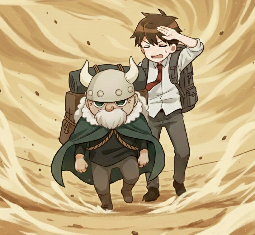 吹き荒ぶ砂嵐の中、タカシは右腕で顔を覆い、前傾姿勢で突き進んでいた。両側に鋭い岩盤が切り立つ深い峡谷。その先に、不気味にそびえ立つ巨大なタワー。隣には、黙々と歩くヤマチュウの姿がある。