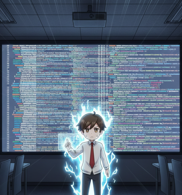 大スクリーンに映し出された膨大なソースコード。 タカシはそれを「超速」でスクロールさせた。 「早すぎて見えないよ!」という声を背に、「全部分かります」と即答する。