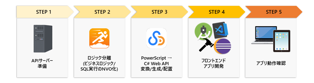 サーバー環境に関しては前回のWebAPI連携システムへのマイグレーションで解説した内容と同じです。アプリケーションに備わる機能をRapidSharp Bundleに含まれる製品ですべてWeb API化する必要はありません。PowerBuilderアプリケーションソースコードのビジネスロジック、データアクセスが分離されていれば比較的容易にWeb APIを開発することができます。つまり費用や期間、ソース解析などのコストやリスクを抑えてAPIサーバーへ配布できるメリットが前回と同じく実現できるのです。