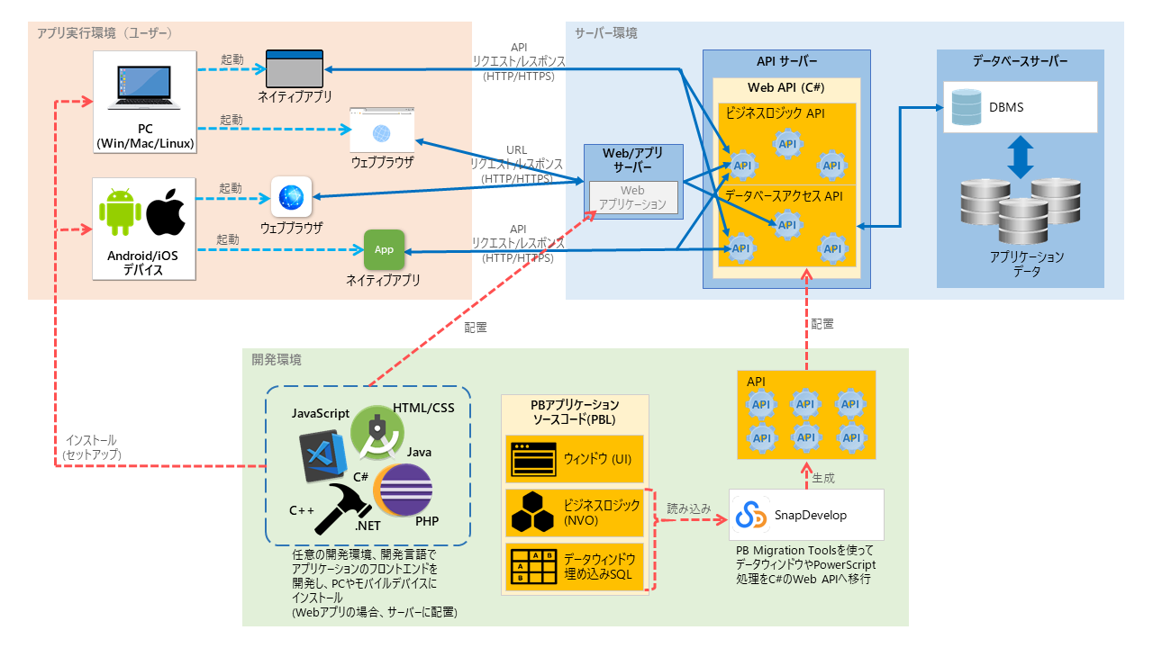 そこで今回は、バックエンドはRapidSharp Bundleで提供する製品でPowerBuilder資産のビジネスロジックやデータアクセス処理をWeb API化し、フロントエンドはVisual StudioやEclipse、Xcode、Android Studioで開発する構成をご紹介します。