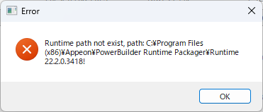 右側のメッセージは EXE と一緒に配布した XML に記述されているパスが間違っているようです。”<アプリケーション名>.XML” は『PB ランタイムの場所はここだよ!』と示しているファイルです。 PowerBuiler アプリケーションは従順なので、XML ファイルが存在する場合はそのパスしか見ません。ランタイムパッケージャで作成したインストーラーでランタイムを配布した場合は、XML にそのインストール先を設定してみてください。