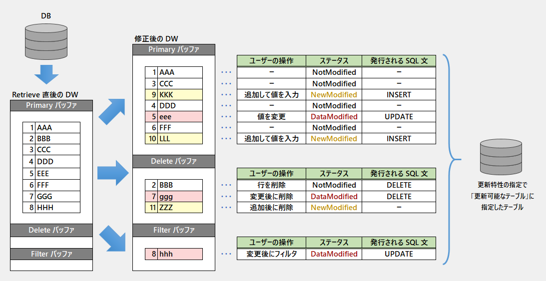 まずデータの追加についてです。 検索された直後はすべてのデータが Primary バッファに格納されます。 「修正後の DW」を見ていただくと行 9、10 が追加されていますね。 これらはユーザーの操作 (InsertRow) により追加された行です。 追加して値が入力された行のステータスは NewModified となり、入力された値をもとに INSERT 文が発行されます。