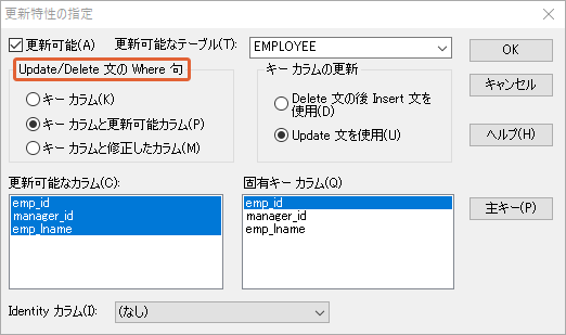 今回は「更新特性の指定」の「Update/Delete キーの Where 句 」について説明していくにゃ。