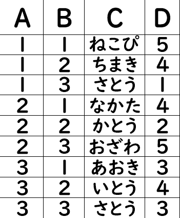 前回のブログにも出てきましたが、たとえば下のような生徒テーブル (A : クラス、B : 番号、C : 名前、D : 成績) があるとします。