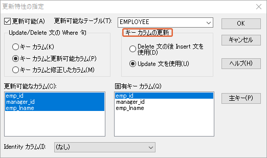 キーを更新できる処理では上記のようなことが起こり得るので、「Delete 文の後 Insert 文を使用」に設定しておけば安心です。