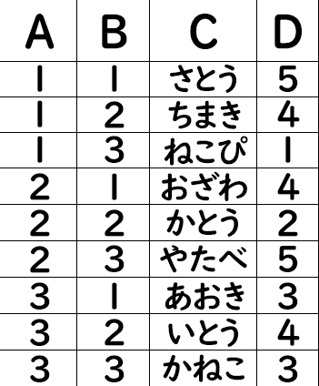 たとえば右のような生徒テーブル (A : 学年、B : クラス、C : 名前、D : 成績) があります。