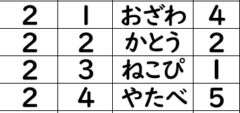 それでは、ここで・・・この学校で 1 組 3 番のねこぴくんが 2 組に編入するとします。
