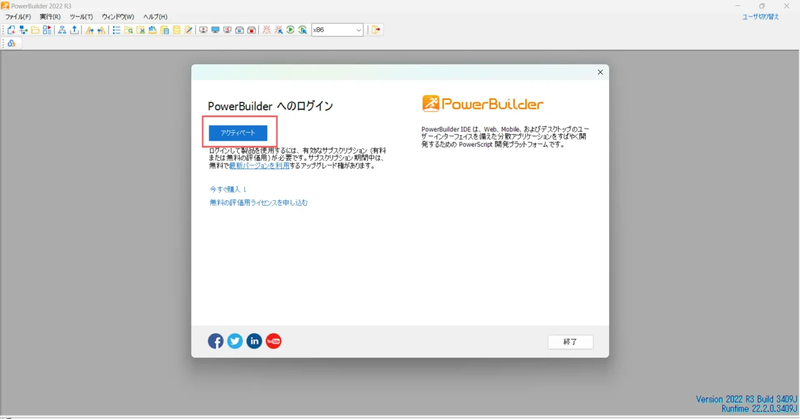 起動すると、 [アクティベート] というボタンから、 PowerBuilder にログインを行う必要があります。