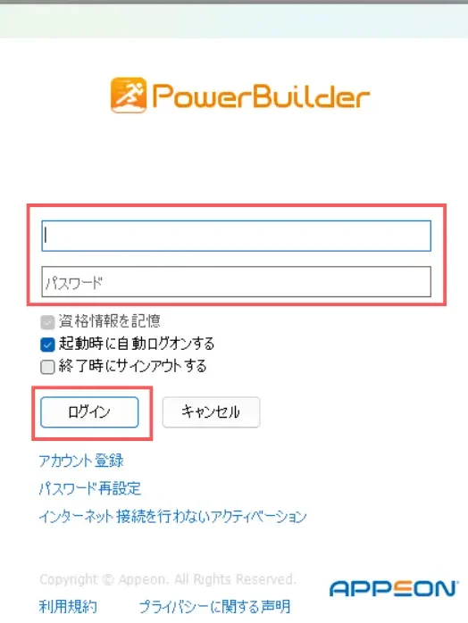 ライセンスが割り当てられた状態で、Appeon の Web サイトのログイン情報を PowerBuilder IDE 上に入力することで PowerBuilder が使用できるようになります。