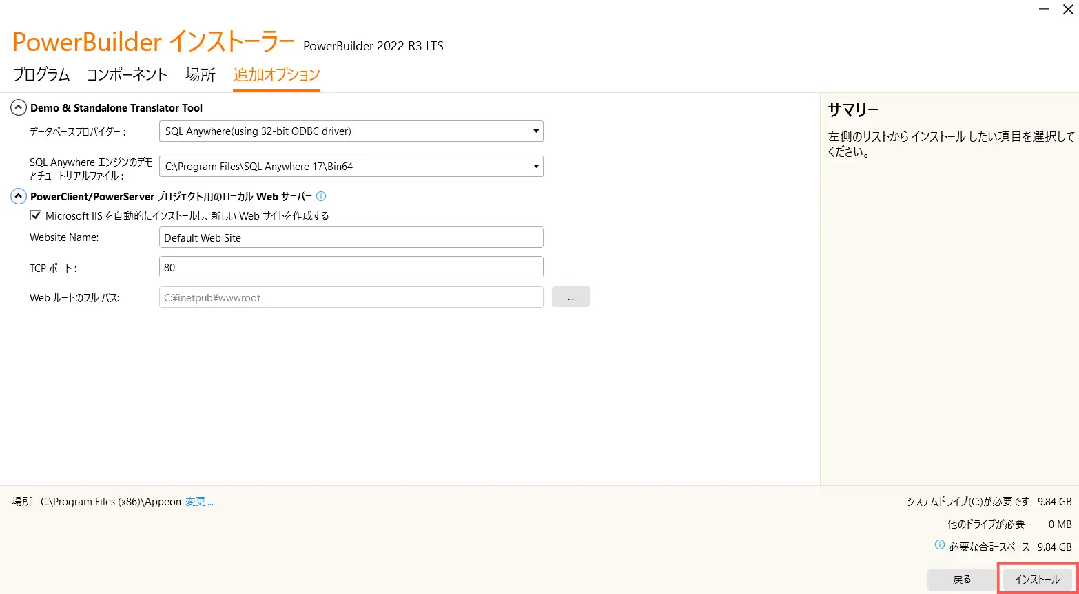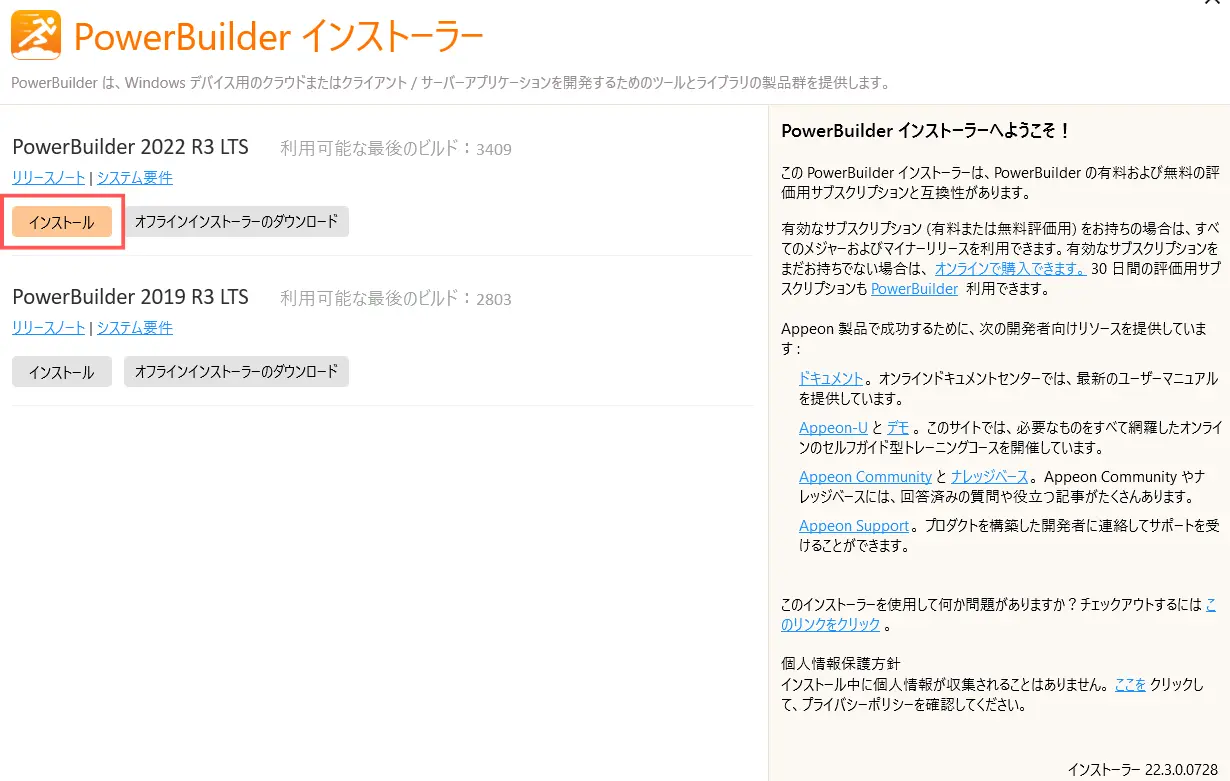 今回は PowerBuilder 2022 R3 の [インストール] をクリックします。
