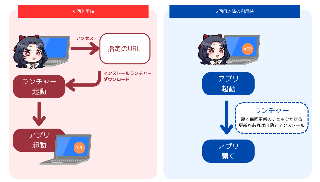 『PowerServer 2022 R3』のアプリをクライアント端末で使う際の動きとしては、指定の URL を開くと PowerBuilder アプリのランチャーがインストールされて、それから PowerBuilder アプリが起動する仕組みになっています(初回利用時のみ)。