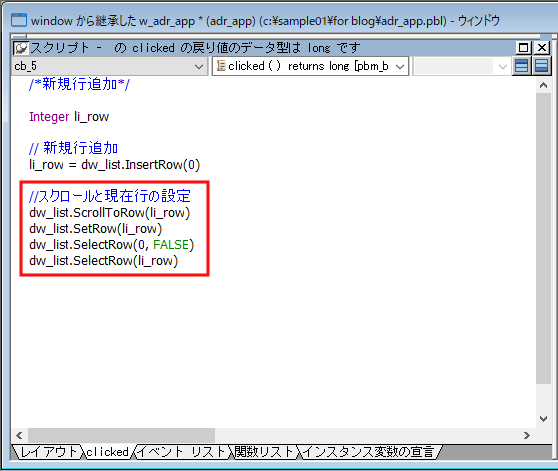 コード内では dw_list.InsertRow(0) とあります。