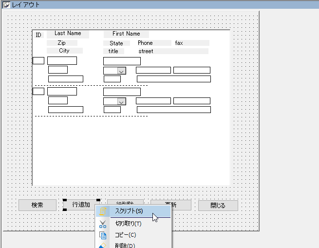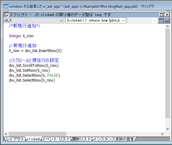 「w_adr_app」のウィンドウオブジェクトを開き、「行追加」のコマンドボタンを右クリックでスクリプトを開きます。