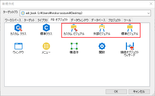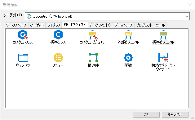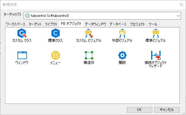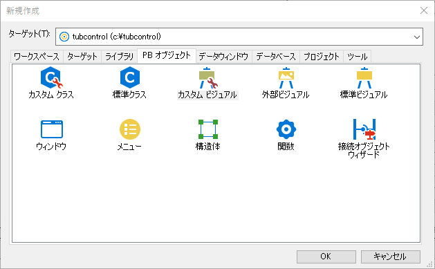 この 2 つのユーザーオブジェクトは、IDE 上のメニューバーの「ファイル」-「新規作成」-「PB オブジェクト」、もしくはパワーバーから「新規作成」- 「PB オブジェクト」を開いていただくと確認できます。