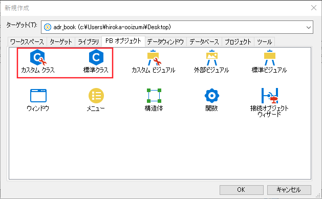 それでは「新規作成」-「PB オブジェクト」タブ – 「カスタム クラス」を選択します。