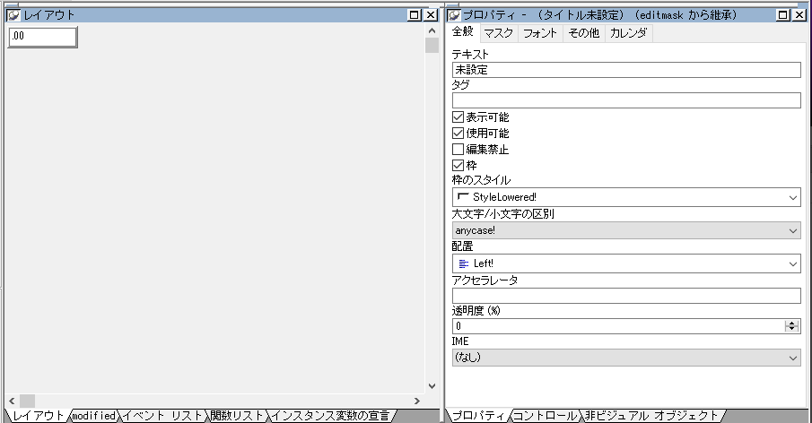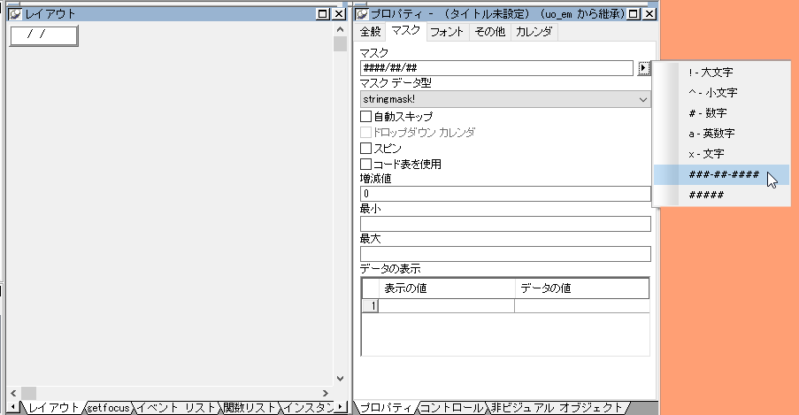 プロパティは全般タブの「テキスト」を空欄、「IME」の設定はなしで、マスクタブの「マスク」は空欄にし、「マスクデータ型」は 「stringmask! 」にしてみましょう。