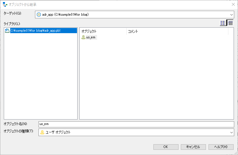 メニューバーから「ファイル」-「継承」を選択し、先ほど作成した「uo_em」の先祖オブジェクトを選択してみましょう。