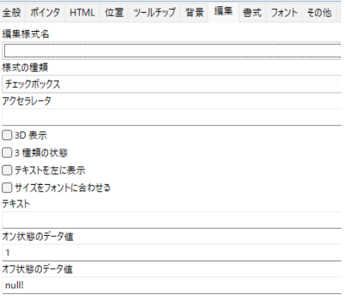 編集様式を「チェックボックス」に設定したカラムでは、対象のデータウィンドウカラムのプロパティの編集タブにて、「オフ状態のデータ値」に「null!」を設定することで NULL 値を設定することが可能です(詳細は参考画像を確認)。